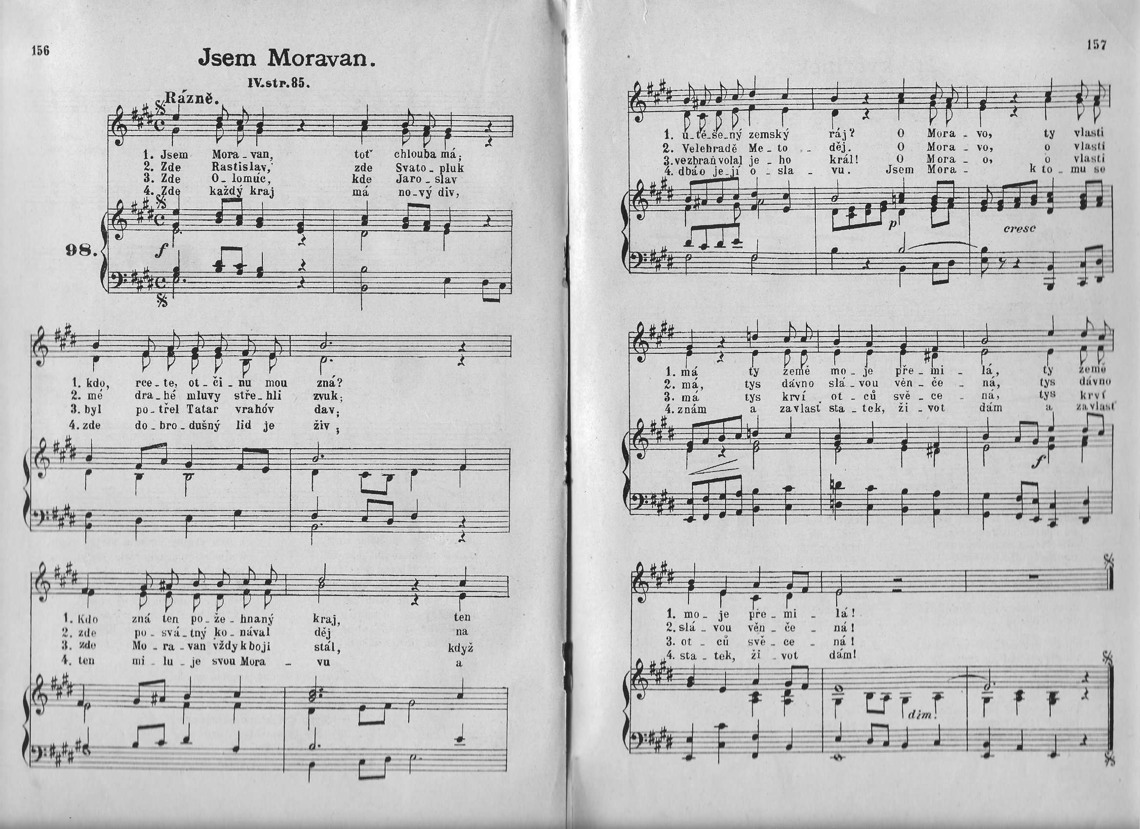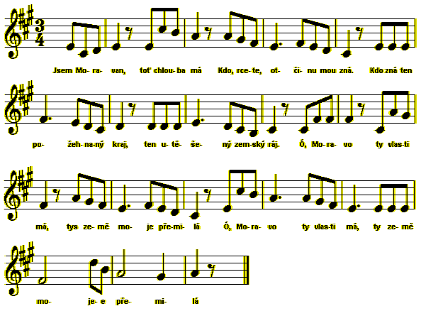 Jsem Moravan — toť chlouba má, kdo, rcete, otčinu mou zná? Kdo zná ten požehnaný kraj, ten utěšený zemský ráj? Ó Moravo — ty vlasti má, tys země moje přemilá! |