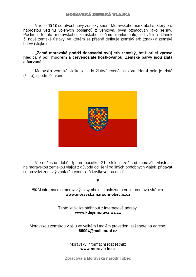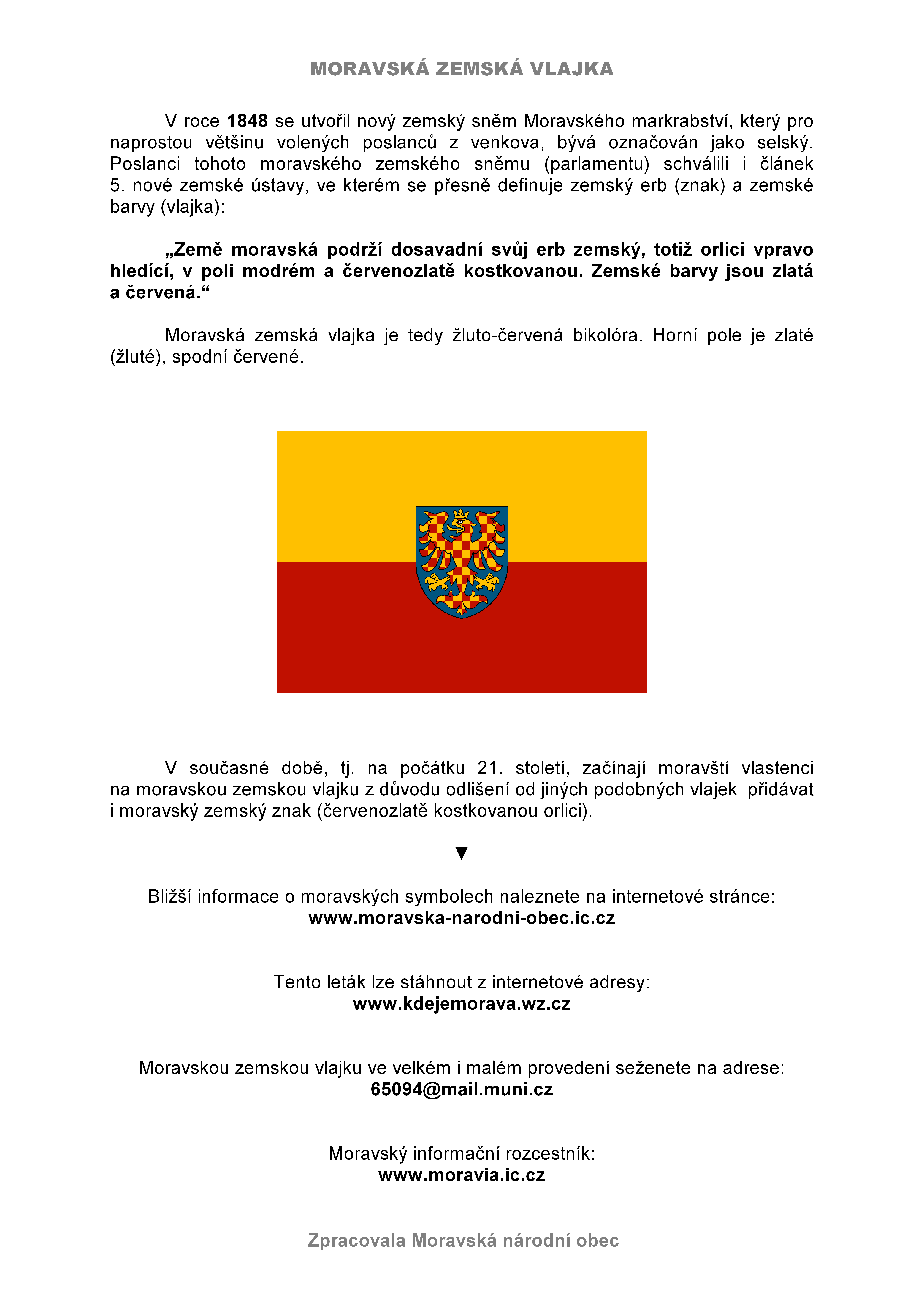 Leták se základními informacemi o vlajce je k dispozici ke stažení zde, pro tisk je vhodnější tento dokument pdf nebo ve formátu doc, přp. velká verze obrázku. Podrobnější informace se dozvíte na stránkách Moravské národní obce.
